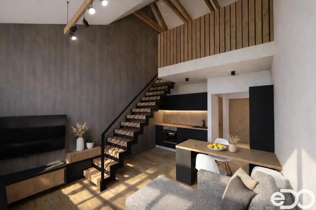 Byt je kompletně vybaven nábytkem na míru, který maximálně využívá prostor a podtrhuje moderní horský styl interiéru. Součástí je kvalitní kuchyňská linka včetně spotřebičů značky Siemens.
