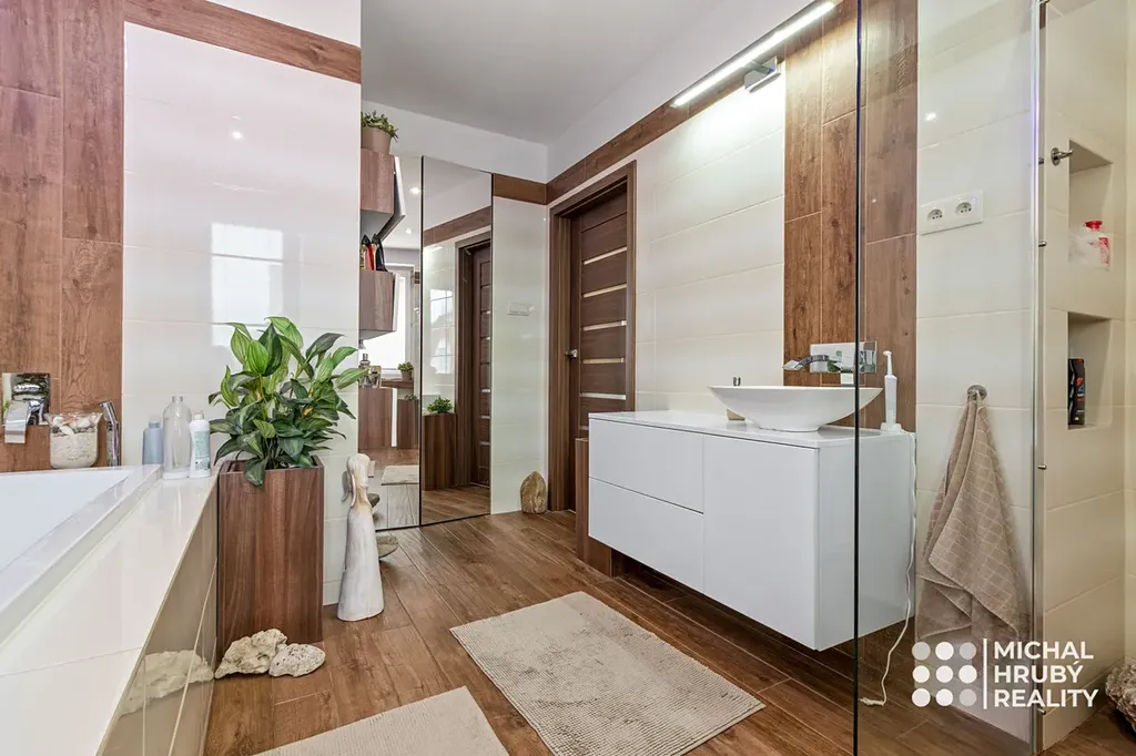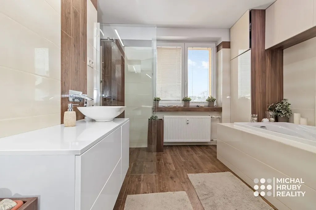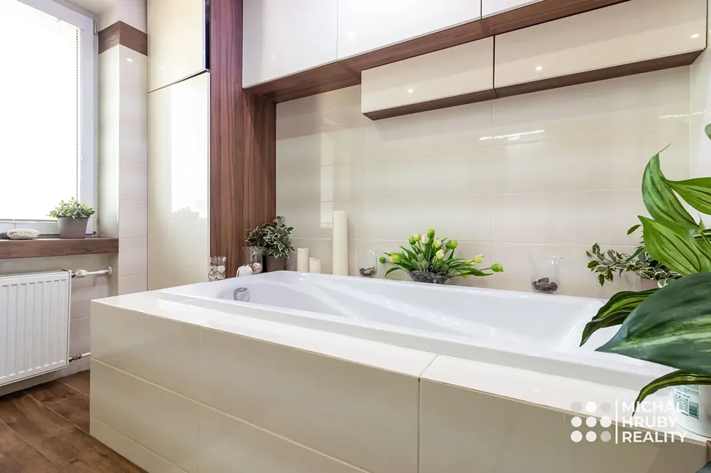 Například dominantní obývací pokoj spojen s kuchyní, která stylově zapadá do konceptu celého bytu. Spotřebiče zabudované stylově přímo do stěny spolu s praktickou spíží, vše se speciální úpravou proti špíně a otiskům. Nebo koupelnu, která je jednou z nejhezčích, jakou jsem kdy v bytě viděl. Vznikla z původního pokoje, takže je nadstandardně velké, najdete v ní vanu i sprchový kout, vše opět ve vysokém standardu.