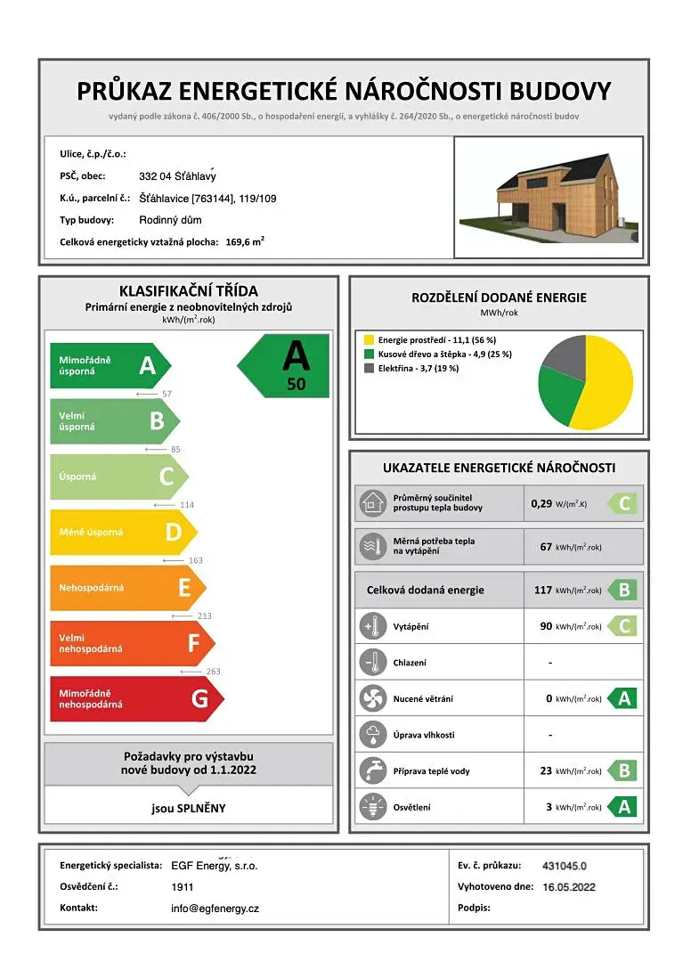 V domě jsou použity nadstandardních prvky, technologie a interiérového vybavení, které výrazně zvyšují komfort bydlení, estetickou hodnotu i energetickou soběstačnost. Dům disponuje FVE (12 panelů), tepelným čerpadlem a krbovými kamny, což zajišťuje nadstandardní energetickou soběstačnost. FVE GoodWe – výkon 4,5 kW, baterie 7,1 kWh, střídač 8 kW, tepelné čerpadlo Neoré 8GT (voda–vzduch) s funkcí podlahového vytápění a chlazení, Wallbox GoodWe 22 kW pro nabíjení elektromobilu.