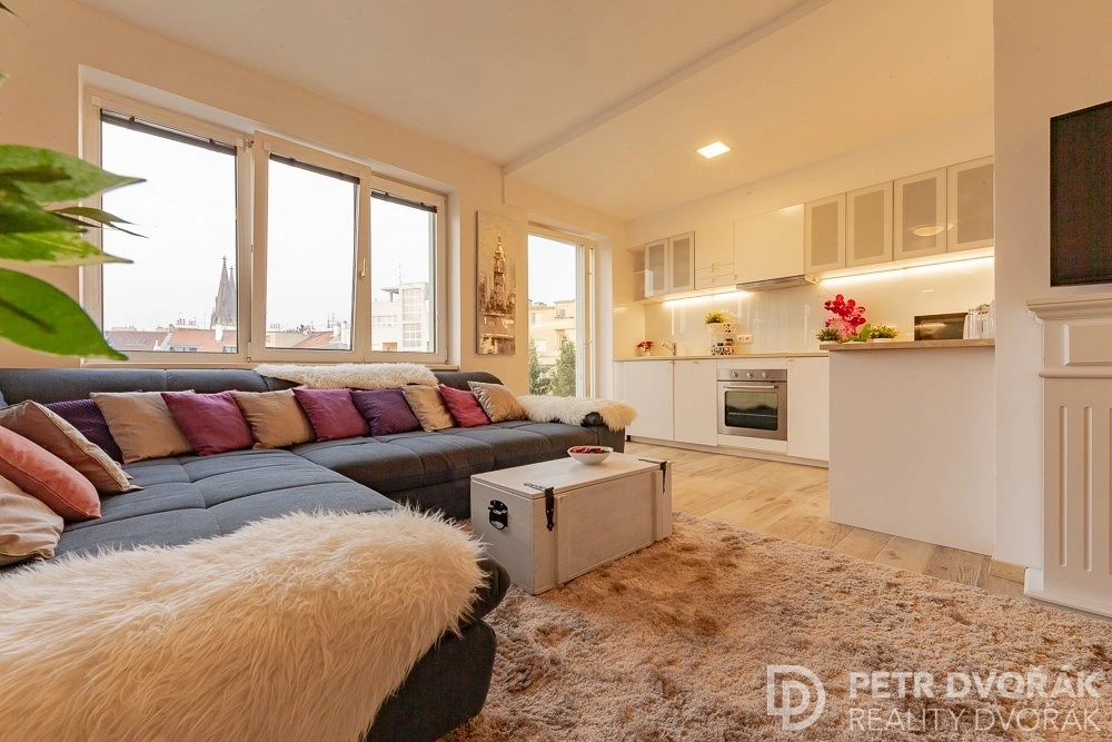 Interiér bytu tvoří prostorný obývací pokoj s plně vybavenou kuchyní, ze kterého je vstup na balkon s otevřenými výhledy na okolní zástavbu Vinohrad, včetně ikonických věží chrámu sv. Ludmily na Náměstí Míru. Dispozici dále doplňují dvě samostatné ložnice, koupelna s vanou, samostatná toaleta a vstupní hala.