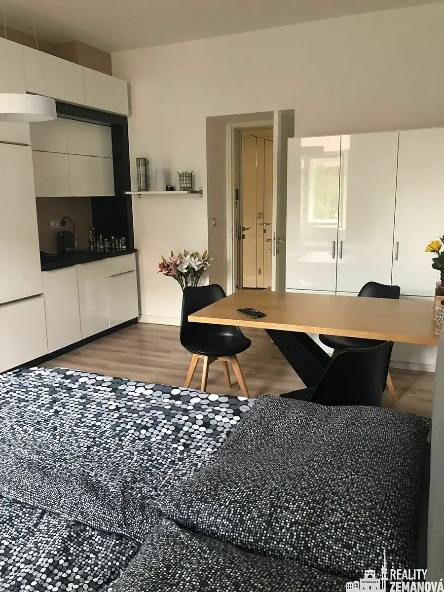 Metro do 3 minut chůze. Popis bytu: předsíň, koupelna (sprcha, umyvadlo), technická místnost (elektrický kotel a automatická pračka) samostatné WC. V obytné místnosti je bílá kuchyňská linka s elektrickou deskou/dvou plotýnkou, myčkou, digestoří, lednicí s mrazákem.