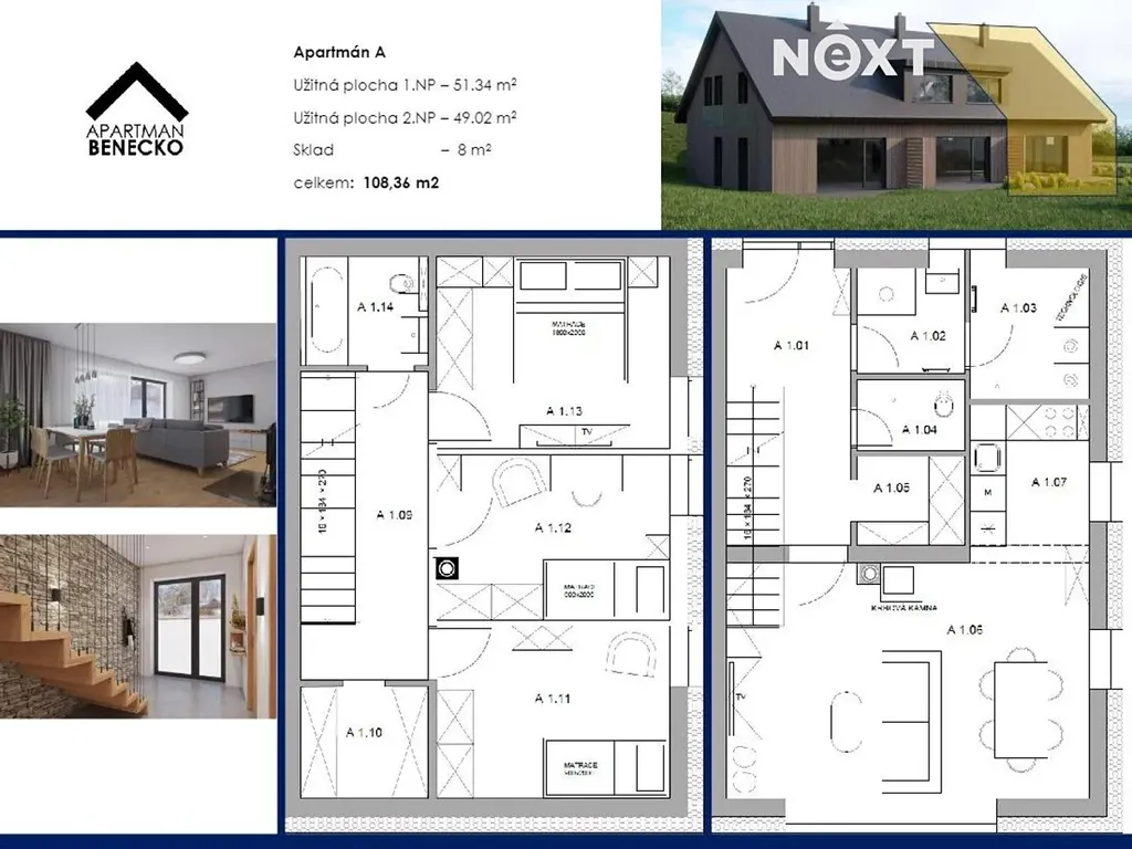 Projekt apartmánového domu obsahuje tři samostatné bytové jednotky s vlastním vchodem, skladem na sportovní náčiní, vlastním přímým vstupem na terasu a do zahrady. Každý apartmán je rozložen do dvou pater a má celkovou rozlohu cca 108 m2.