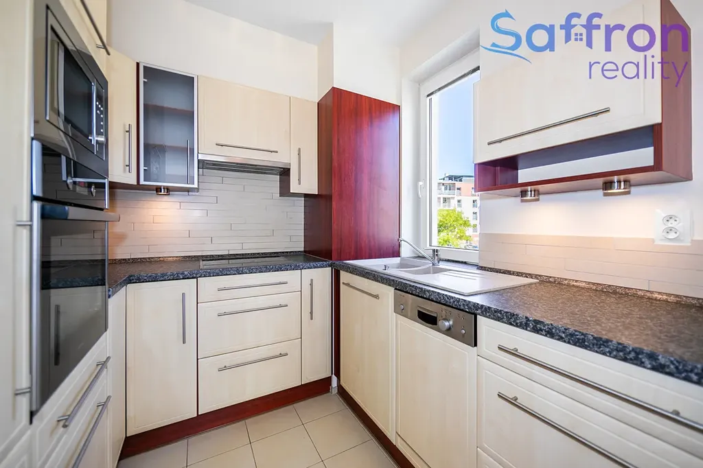 Obývací část plynule navazuje na kuchyň s barovým pultem, která je plně vybavena spotřebiči – k dispozici je lednice s mrazákem, myčka, sklokeramická varná deska, trouba, digestoř i mikrovlnná trouba. Vstupní chodba nabízí vestavěné skříně na míru, koupelna je řešena s vanou, toaletou a pračkou.