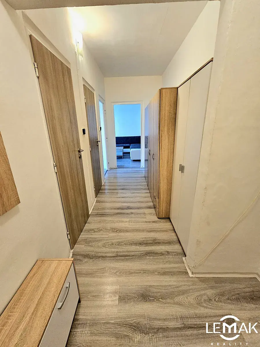 Za vstupními dveřmi bytu vejdeme do prostorné chodby s dostatkem úložných prostor, dále potom samostatné toalety, koupelny se sprchovým koutem, pračkou a umyvadlem se skříňkou. Po levé straně poté kuchyně s kombinovanou lednicí, plynovým sporákem s horkovzdušnou troubou, mikrovlnnou troubou a jídelním koutem, v rohu také policový systém sloužící jako špajz.