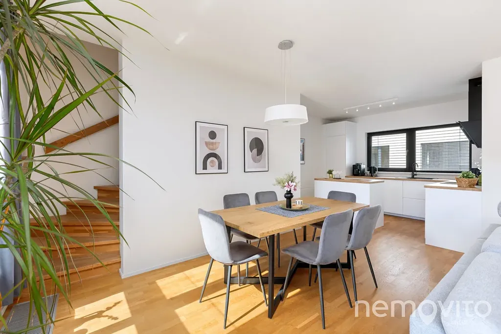 Díky velké ploše je velikost obýváku skutečně velkorysá. 39 m2 poskytuje dostatek prostoru pro plnohodnotnou jídelnu, která navazuje na kuchyni do tvaru U, ke které pod schody náleží také spižírna. V části pro pohovku či pracovnu je pak výstup na 5 m2 balkon s orientací na jih, tedy směrem na Šmukýřku. Díky orientaci na odvrácenou stranu od vytížených tahů je tak v bytě skutečně klid. Velkoformátová okna zajišťují vysokou míru proslunění, které lze však regulovat venkovními žaluziemi.