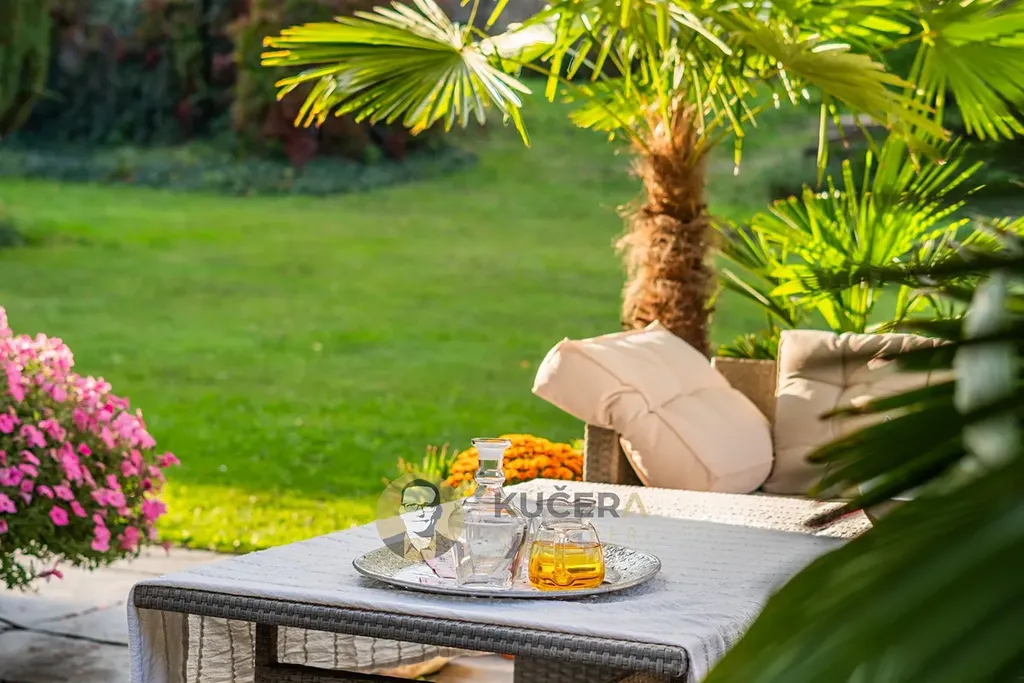 Atmosféru celého místa dotváří kamenné zdi původních stodol, které byly citlivě začleněny do zahrady a vytvářejí jedinečný rámec připomínající malebnou toskánskou scenérii. K domu přímo navazuje terasa z přírodní břidlice o ploše 40 m², ideální pro letní posezení nebo rodinné oslavy.