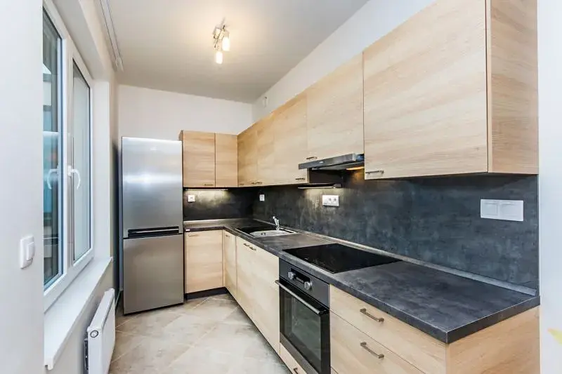 Byt je vybavený novou kuchyňskou linkou, sklokeramickou varnou deskou, troubou, lednicí a myčkou.