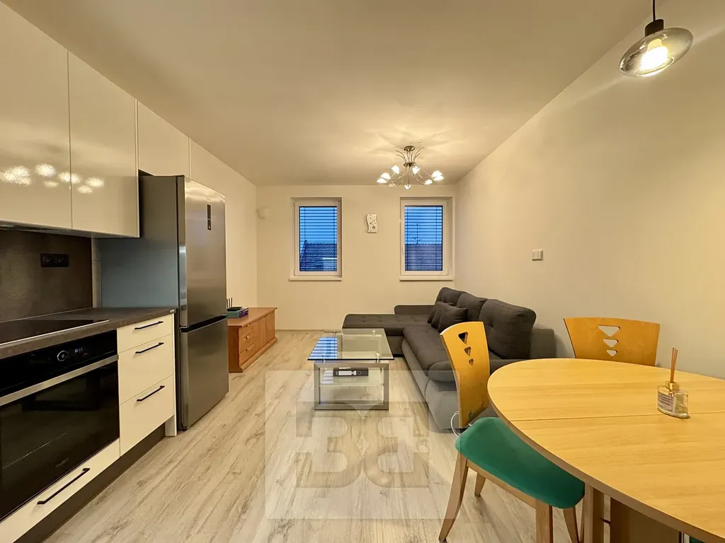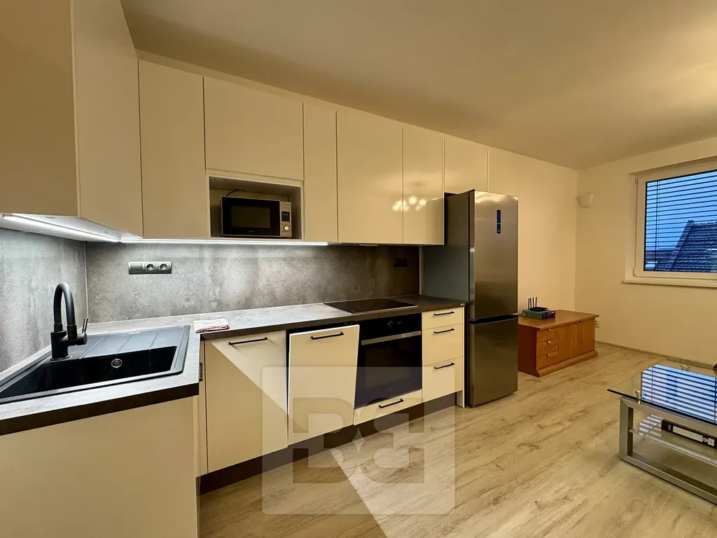 Byt je ve výborném stavu, působí velmi svěže a moderně. Dispozice bytu nabízí vstupní předsíň s úložným prostorem, obývací pokoj s kuchyňským koutem, který je kompletně vybaven spotřebiči, dále samostatné WC, prostornou koupelnu a samostatnou menší ložnici se skříní.