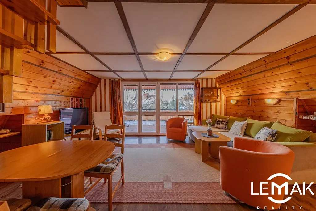 V prvním patře je prostorný obývací pokoj s kamny, která vytvářejí příjemné teplo i atmosféru celého prostoru. Tento pokoj je propojen s částečně krytou terasou, odkud lze sejít přímo na zahradu a ke grilovacímu přístřešku. Kuchyň je umístěna prakticky v zákrytu obytného prostoru, oddělená, a přesto přirozeně propojená s děním v místnosti. V prvním patře i v podkroví jsou položeny plovoucí podlahy.