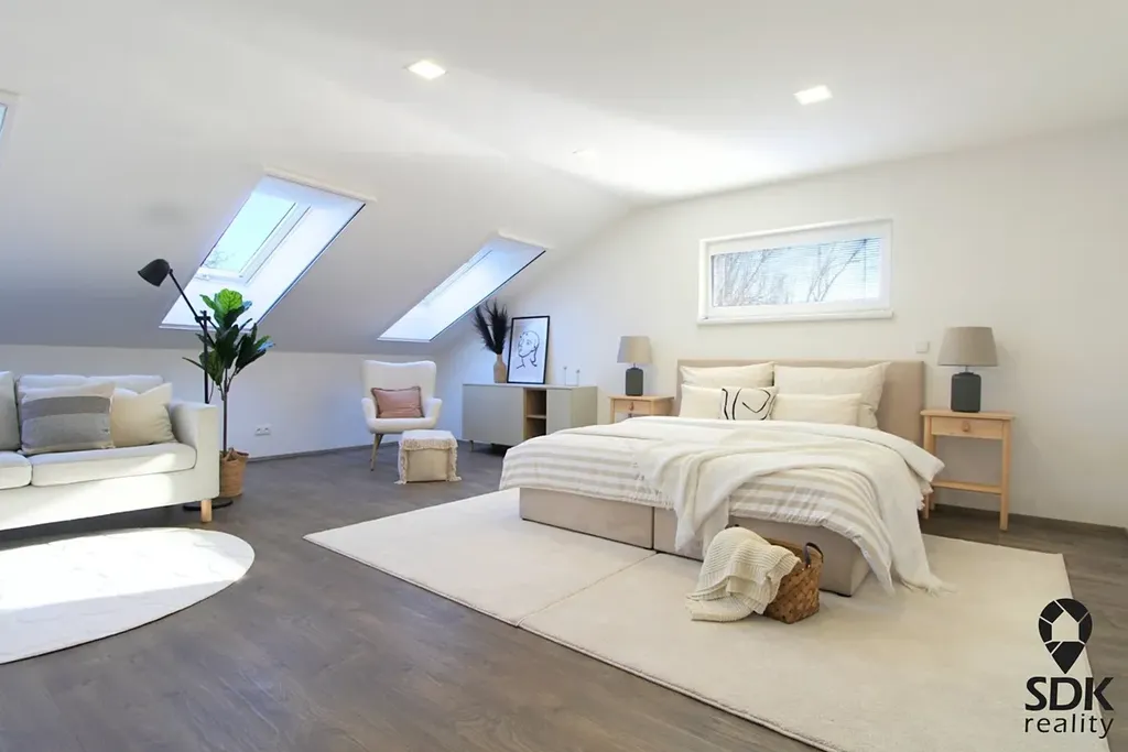 V podkroví je velký pokoj o výměře 34 m², který lze rozdělit na dva menší. Na proti se nachází další pokoj o velikosti 18 m² propojený s menší místností vhodnou jako šatna nebo pracovna, moderní koupelna o rozloze 12 m² s vanou i sprchovým koutem, připojení pro pračku a sušičku. Z chodby můžete taky mimo jiné vystoupat sklápěcími schody na půdu, která nabízí další úložný prostor.