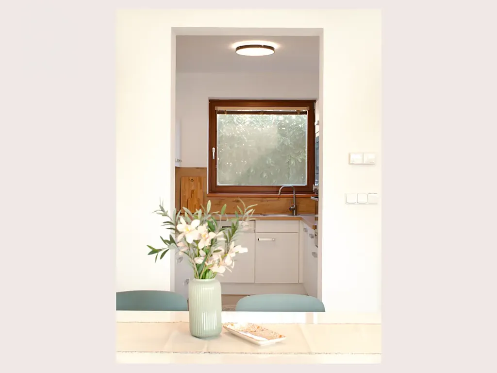 Interiér domu je světlý a vzdušný, s dostatkem přirozeného denního světla ve všech obytných místnostech. Světlost domu je patrná i během zimních měsíců, což je dobře viditelné na přiložených fotografiích.