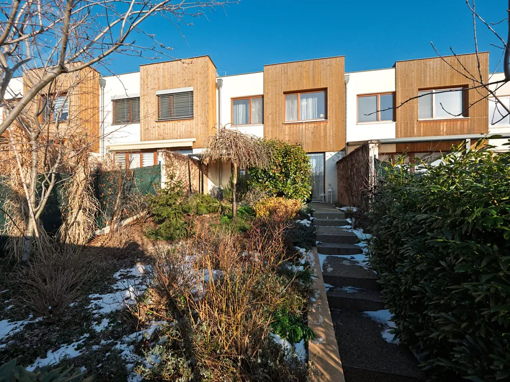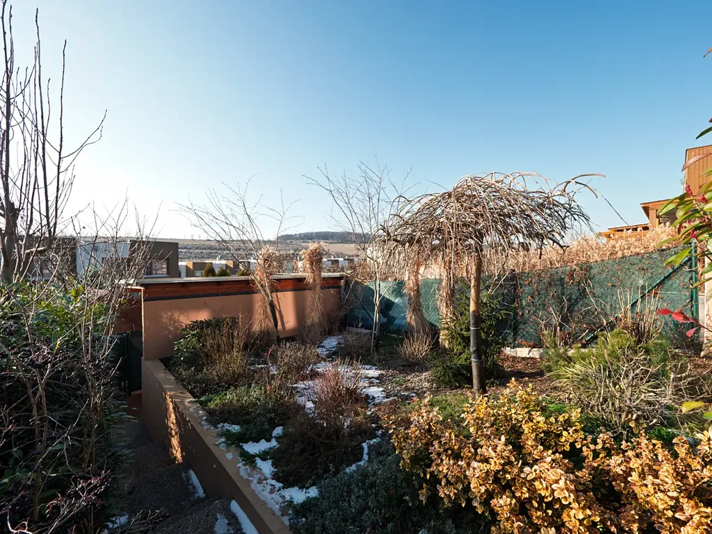 Součástí domu je menší, velmi příjemná zahrada se vzrostlými stromy, která poskytuje dostatek soukromí. Zadní část zahrady je oplocená. K dispozici je dokončená terasa s pergolou a také zahradní domek (5 m2) pro uložení kol, nářadí či sezónních věcí.