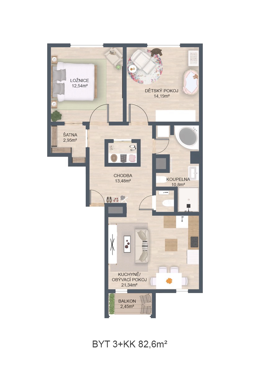 Dispozice 3+kk s balkonem vám zajistí pohodlný a příjemný domov.