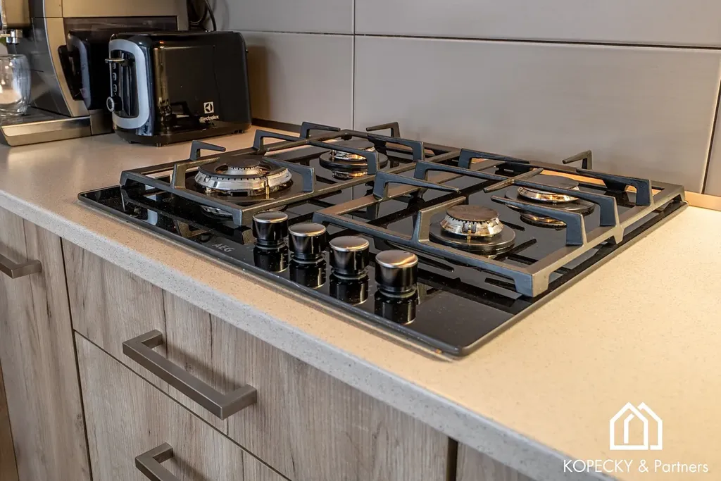 Součástí prodeje je kuchyňská linka včetně spotřebičů: myčka, plynový sporák, elektrická trouba a americká lednice. Byt je připraven tak, aby nový majitel mohl fungovat prakticky okamžitě bez řešení základního vybavení. Podlahy jsou řešeny kombinací dlažby a laminátových podlah, což je ideální jak z hlediska údržby, tak z hlediska pohodlí v obytných místnostech.