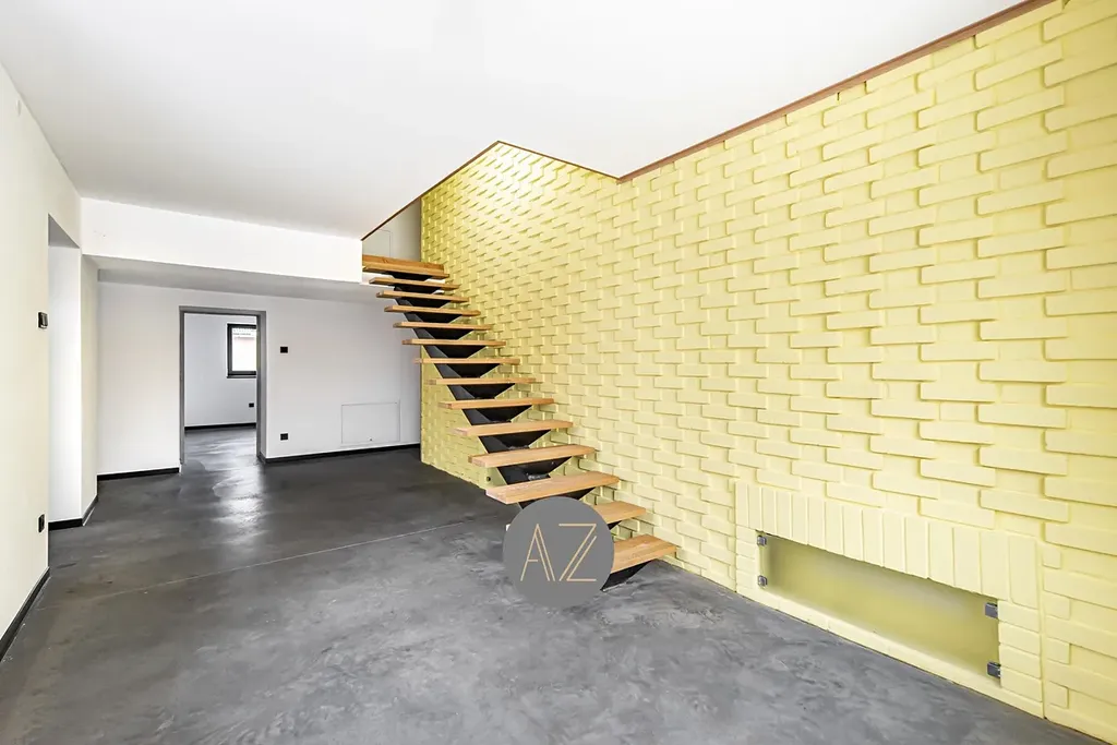 V přízemí domu najdete 3 pokoje s koupelnou a WC a další místnost s využitím např. jako dílna, fitness nebo wellness. Výjimečným designovým prvkem je zde schodiště z ušlechtilého kovu v kombinaci s dubovým dřevem, po jehož pravé straně jsou na stěně přiznané původní cihly, které byly natřeny na žluto, aby dodávaly domu světelnou pohodu a pocit slunečního světla za každého počasí.