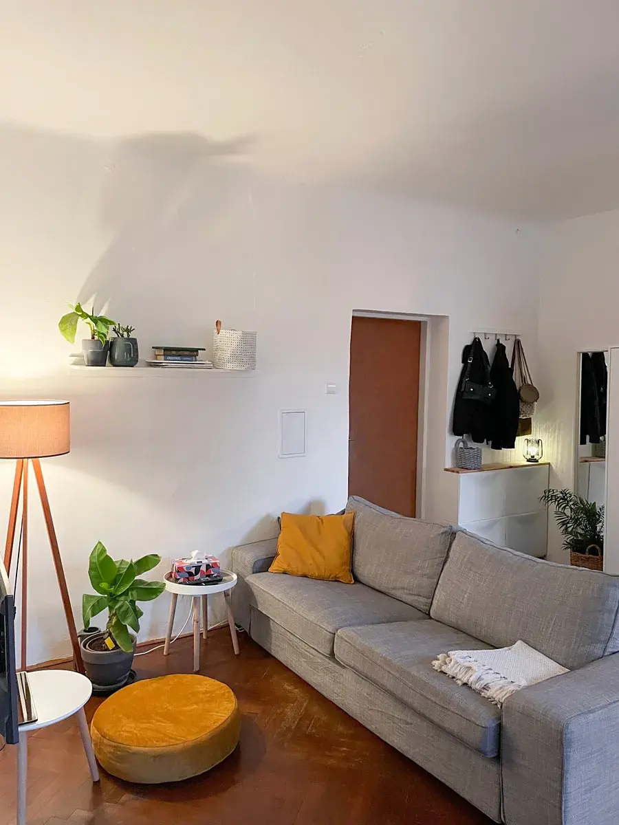 Z chodby (společná pro dva byty), kterou lze využít jako předsíň, se vchází do hlavní místnosti. Ta se člení na obývací část a kuchyňský sektor. Kuchyňský sektor je oddělen od obytné části jídelním stolem a židlemi. Vstup do koupelny se nachází na rozmezí kuchyně a obývací části. Koupelna s oknem je vybavena sprchovým koutem, WC a automatickou pračkou. Na protilehlé straně bytu je situován vstup do malé podkrovní ložnice s přiznanými trámy – viz foto. Nad bytem je vlastní půdní pokoj, možnost jako ateliér či odkládací prostor.