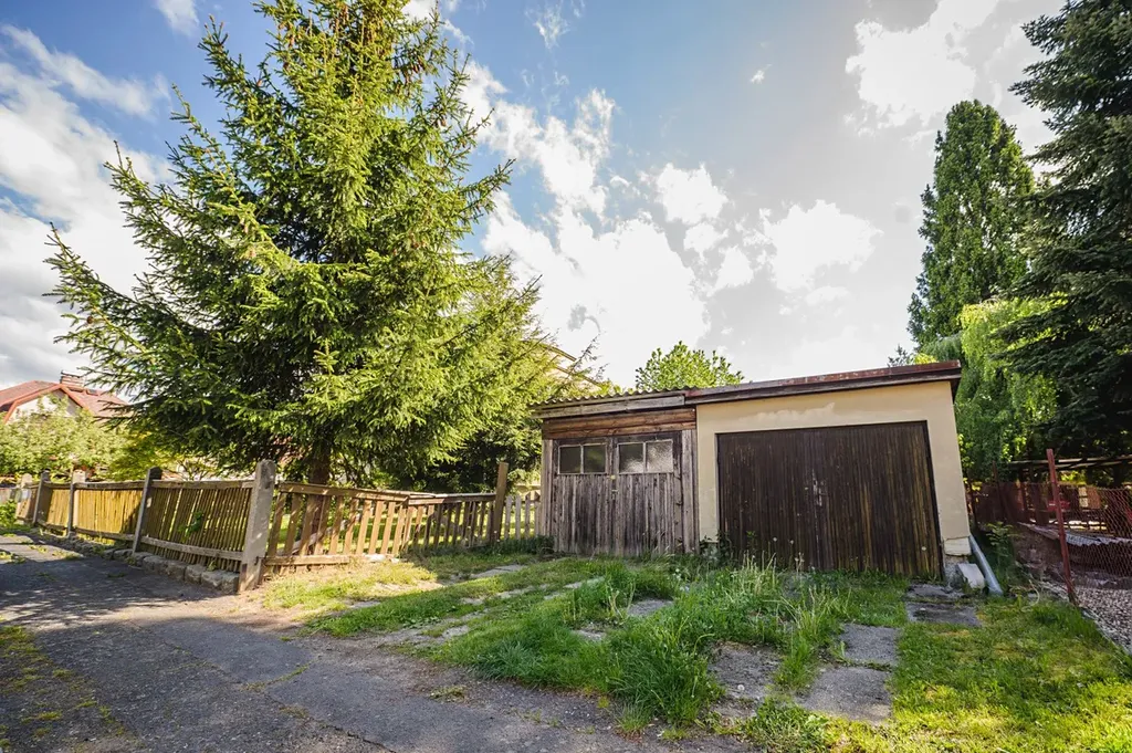 pozemku je garáž s vjezdem z ulice a dřevěnými přístavbami.
