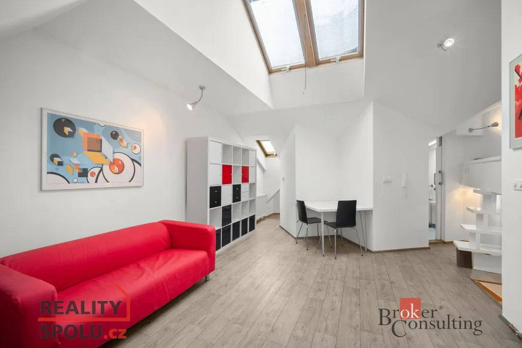 Dominantou bytu je velký obývací pokoj s kuchyňským koutem, ve kterém se nachází vyvýšená postel s výhledem na nebe, dále prostorné zákoutí pro odkládání věcí. Byt nabízí také koupelnu se sprchovým koutem, samostatné WC a praktický prostor pod schody, který lze využít jako šatnu či úložný prostor.