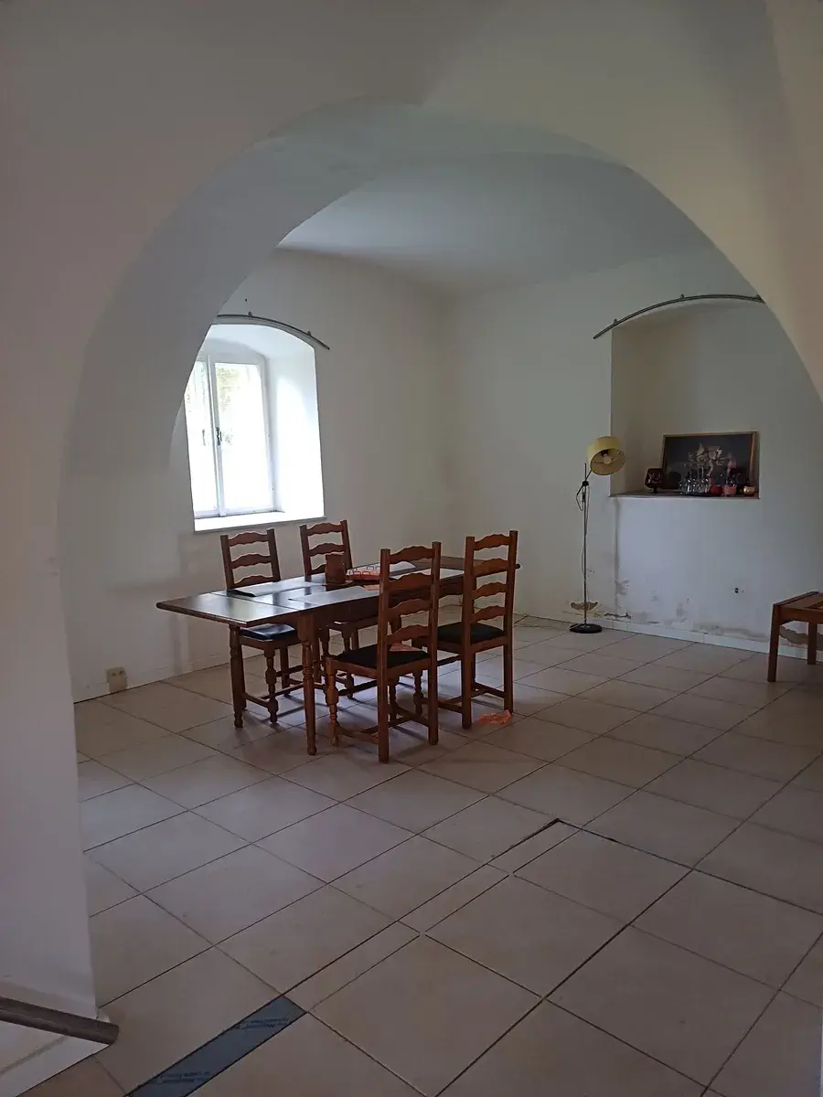 V 1.NP se nachází jídelna s klenutými stropy, kuchyně s vybavenou kuchyňkou linkou, dvoudílnou americkou lednicí, mikrovlnnou troubou, kombinovanou varnou deskou, ohřívacím šuplíkem, kávovarem a elektrickou troubou, posezení u krbu na tuhá paliva a otočné schodiště vedoucí do 2.NP.