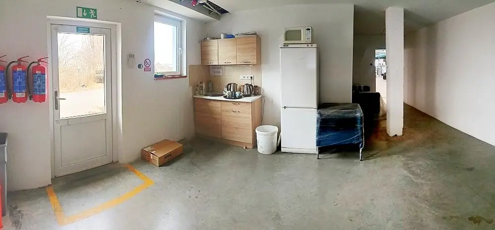 Hala dělena na doposud výrobní středovou část a boční nižší skladové prostora a zázemí pro zaměstnance . - Viz foto. Vše vytápěno - vlastní kotelnou na LTO ( velmi úsporné ) !!! 2x Kancelář, kuchyně, šatny, sprcha, 2x oddělené WC s umyvadlem .