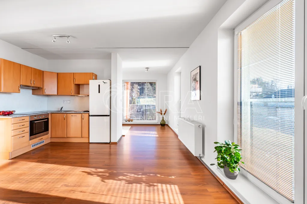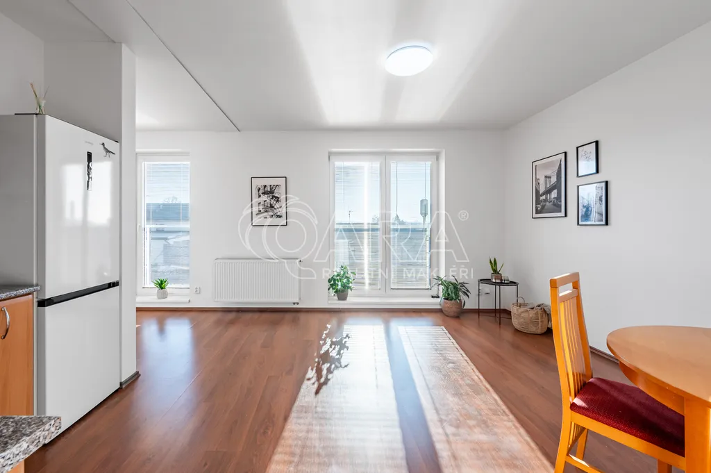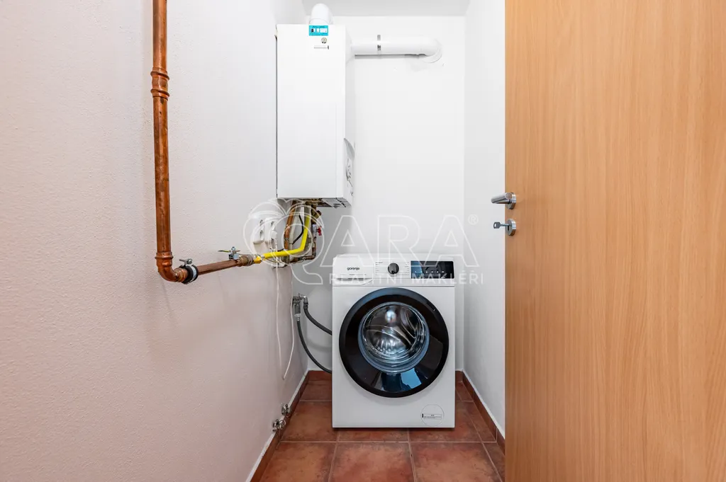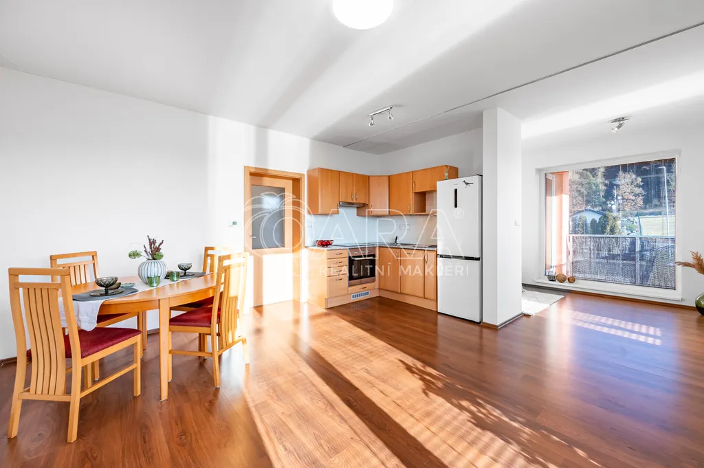 Součástí je kompletně vybavená kuchyňská linka včetně lednice, sklokeramické varné desky, trouby, myčky a digestoře. O teplo a teplou vodu se stará vlastní plynový kotel umístěný v praktické technické místnosti, kde je také pračka, která v bytě zůstává. Velká okna orientovaná na jih a jihozápad zajišťují dostatek denního světla po celý den. V oknech jsou žaluzie.
