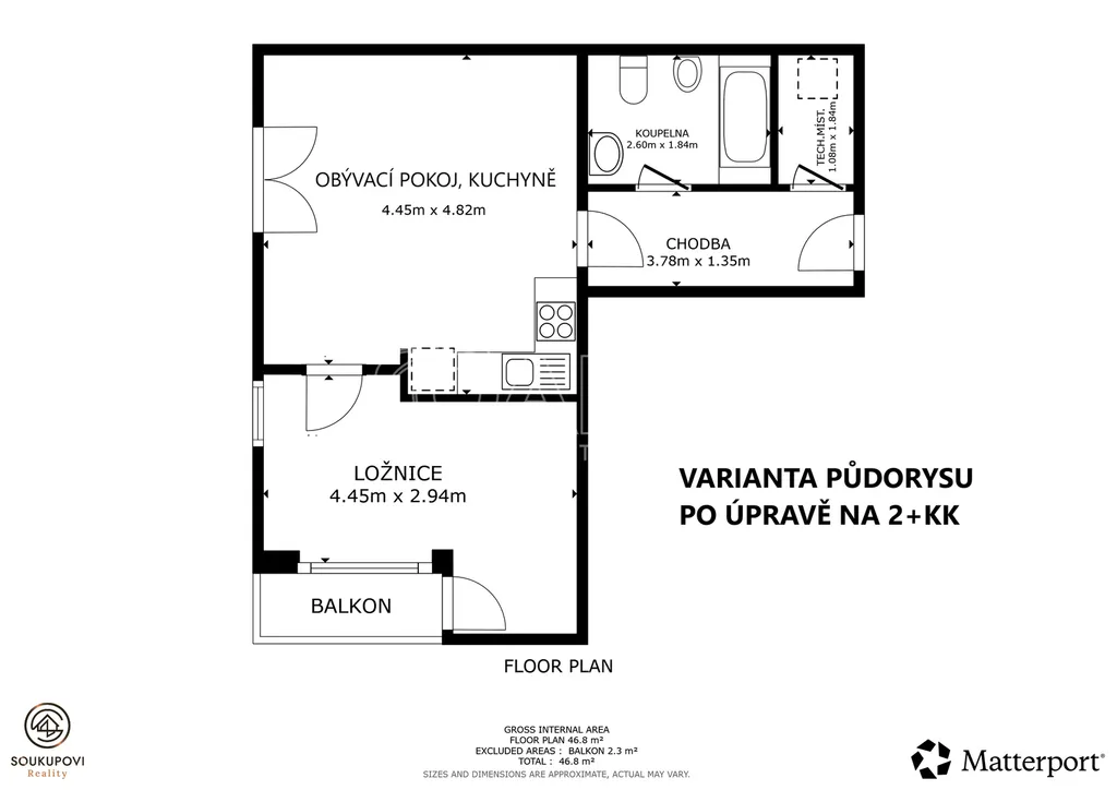 Byt je aktuálně řešený jako 1+kk, ale díky praktickému uspořádání ho lze jednoduše upravit na 2+kk. Vznikne tak plnohodnotné bydlení třeba pro pár, jednotlivce nebo i menší rodinu. Prostorná koupelna je vybavena vanou, WC a bidetem.