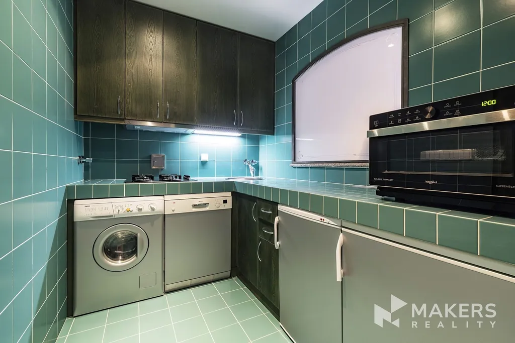 Byt o rozloze 87 m2 zahrnuje obývací pokoj s jídelním koutem, samostatná plně vybavenou kuchyň včetně mikrovlnné trouby, myčky na nádobí a pračky. Obrázek kuchyně v inzerátu byl pořízen z velmi podobného bytu. Dále jsou 2 ložnice, z nichž každá má vlastní šatnu. V bytě také jsou hned 2 koupelny — hlavní koupelna s vanou a druhá je se sprchovým koutem.