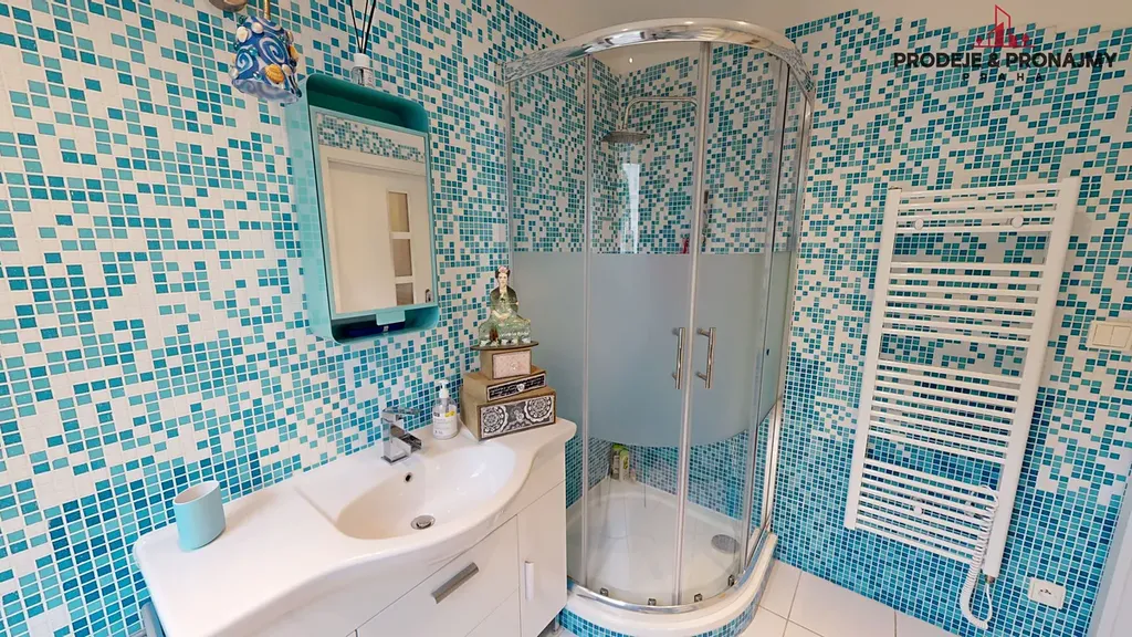 Byt má dvě koupelny s WC: s vanou a se sprchovým koutem. Každá s vlástním kotlem: plyn a elektro.