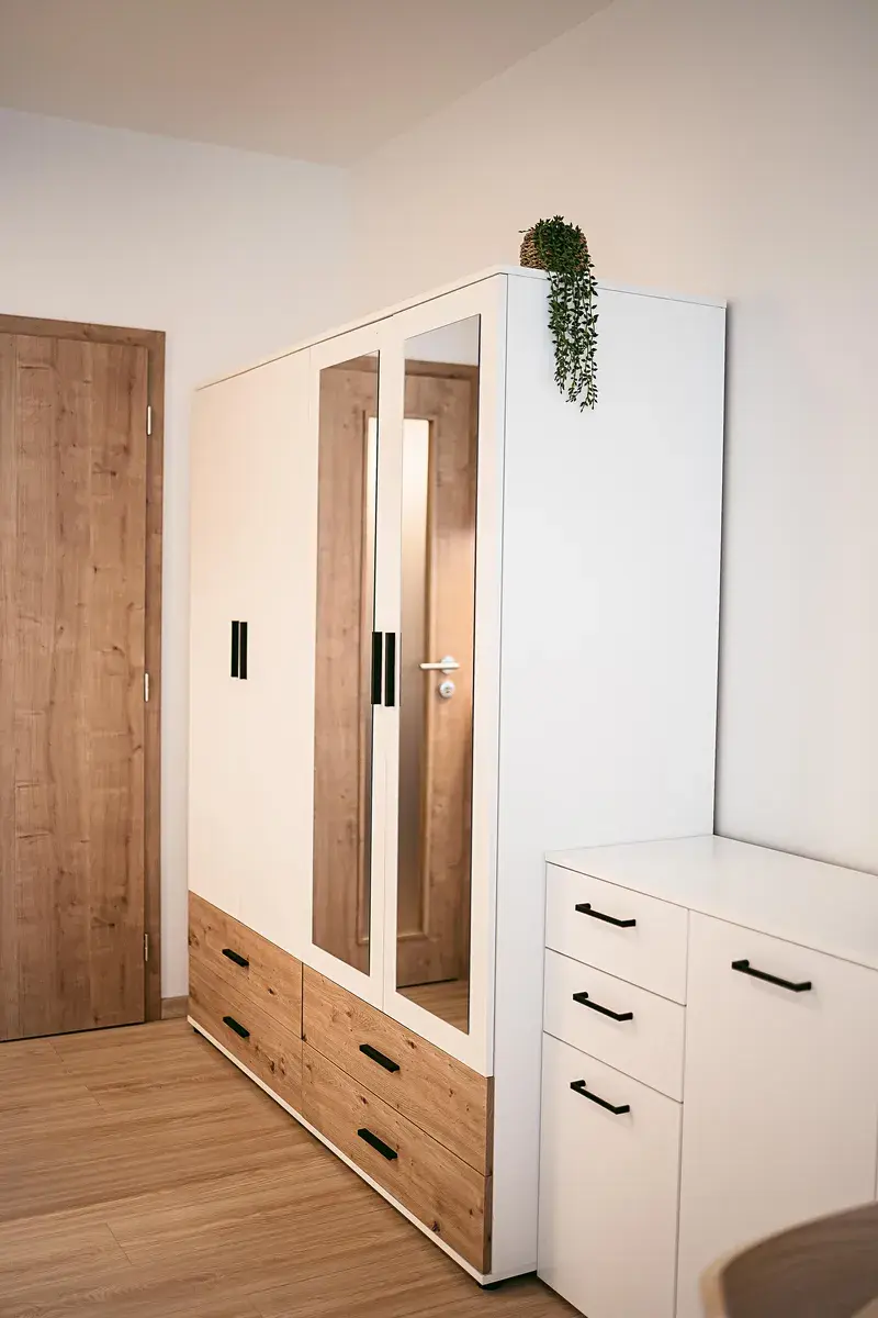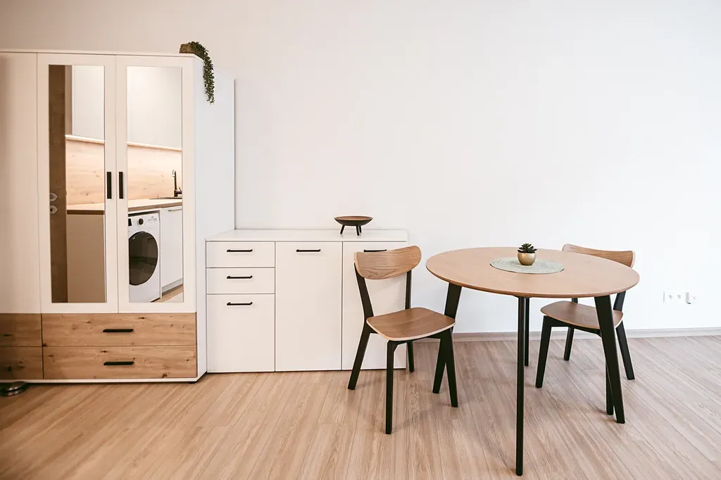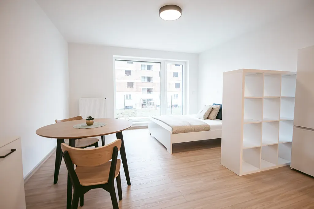 Interiér bytu tvoří hlavní obytná místnost s kuchyňskou linkou, koupelna se sprchovým koutem a toaletou a vstupní chodba. Z hlavní obytné místnosti je přímý vstup na terasu a předzahrádku. Díky velikému francouzskému oknu, které je situováno na jih budete mít ve Vašem novém domově slunce po celý den. O soukromí se postarají venkovní elektrické rolety. Truhlářem na míru vyrobená kuchyňská linka disponuje kvalitními vestavěnými spotřebiči – myčkou, troubou na pečení, pračkou a volně stojící lednicí s mrazákem. O úložný prostor se bát nemusíte. V bytě je prostorná šatní skříň, odkládací komoda se šuplíky a policová skříňka oddělující prostor kuchyně od manželské postele s matracemi. V kuchyňské části je kulatý jídelní stůl se židlemi. Atmosféru dokresluje plovoucí podlaha s dřevěným dekorem. Součástí nabídky je prostorný sklep a venkovní parkovací stání.