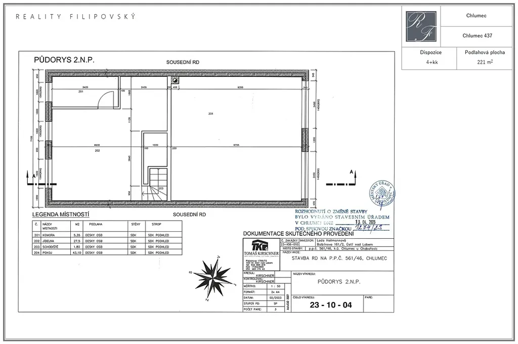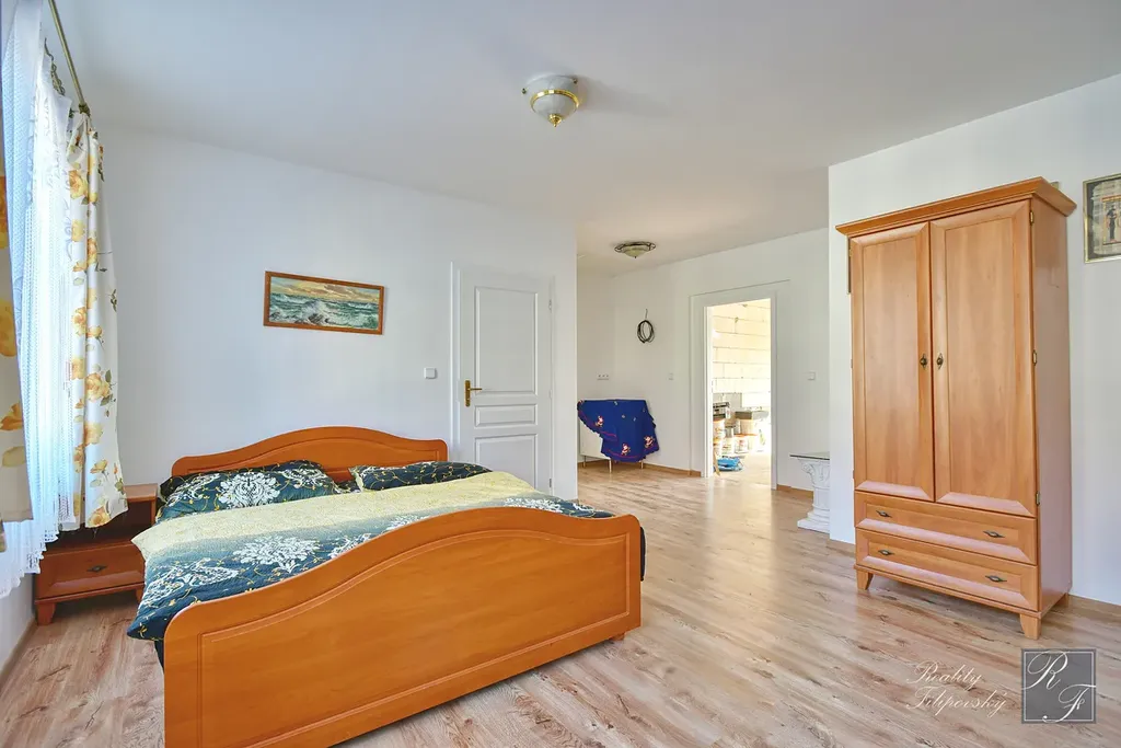 Ve 2. NP najdeme ložnici s koupelnou a toaletou a další místnost o výměře 43 m2, která je těsně před dokončením. Ta může sloužit jako dva samostatné pokoje, nebo jeden velký obytný prostor. Výhodou je, že 2. NP disponuje přípravou instalací pro kuchyňskou linku a dům tak může sloužit i k dvougeneračnímu bydlení, či ke kombinaci bydlení a pronájmu.