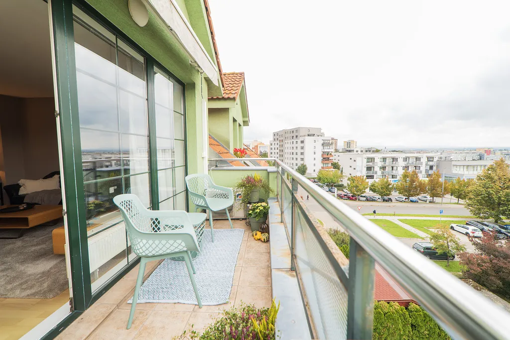 Dispozice bytu nabízí prostorný obývací pokoj s kuchyňským koutem a přímým vstupem na terasu s otevřeným výhledem, dva samostatné pokoje (ložnice a pracovna), koupelnu se sprchovým koutem a toaletou a vstupní chodbu s úložnými prostory. V obývacím pokoji je instalována klimatizace, která zajišťuje komfort i během letních měsíců. K bytu náleží sklepní kóje.