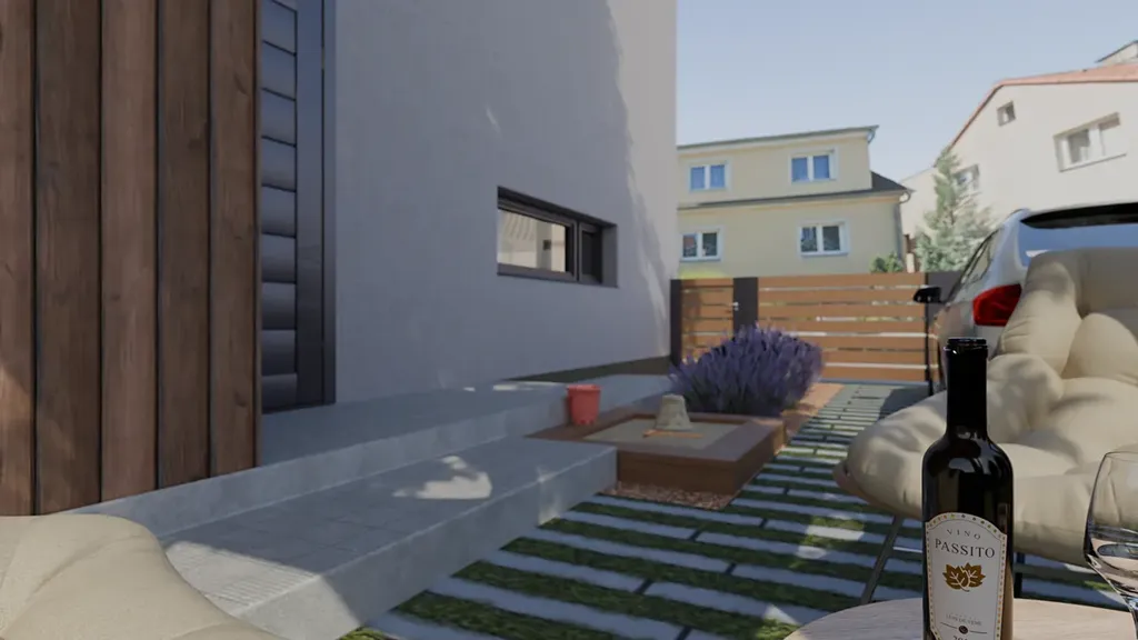 K domu náleží dvě parkovací místa přímo na pozemku a venkovní přístřešek.