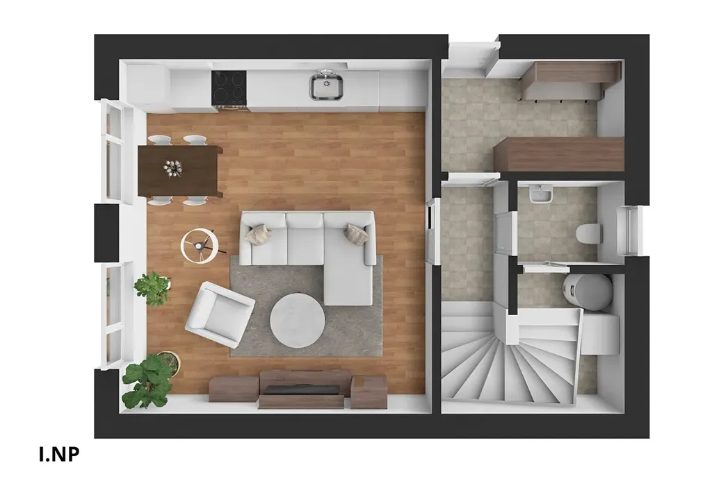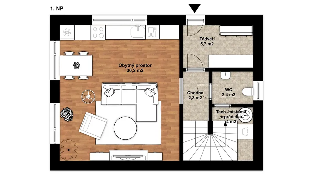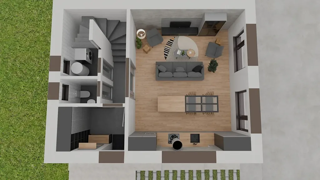 Dispozice domu je 3+kk. V přízemí se nachází zádveří (5,7 m²), prostorný obývací pokoj s kuchyňským koutem (30,2 m²), chodba (2,3 m²), samostatné WC (2,4 m²), technická místnost s prádelnou (4 m²) a krytý venkovní úložný prostor (3,4 m²).