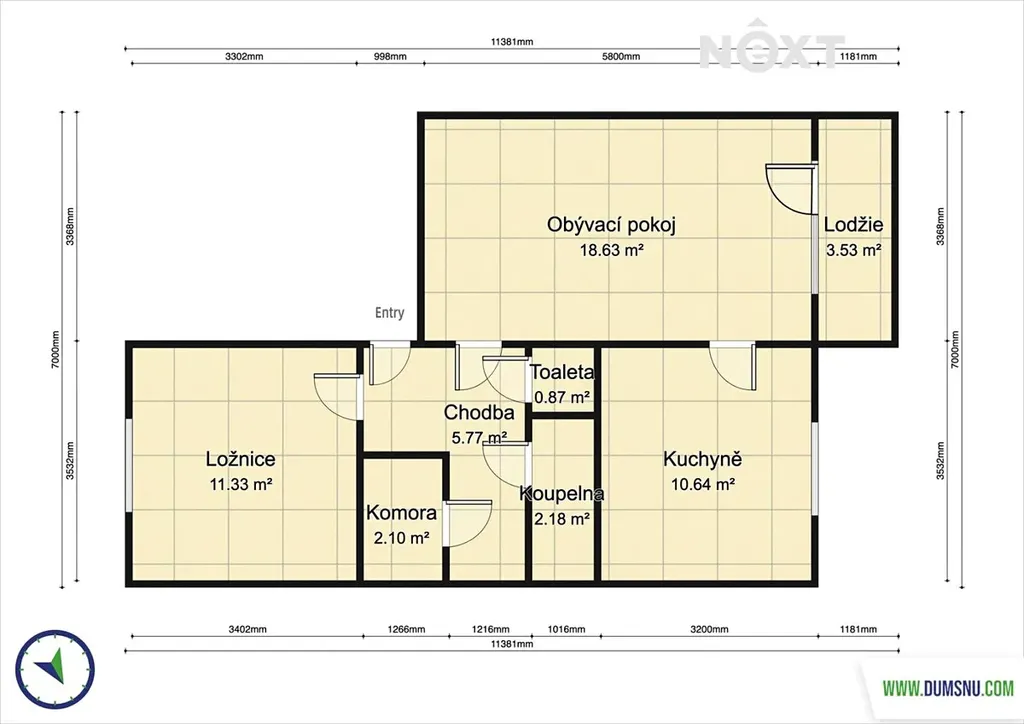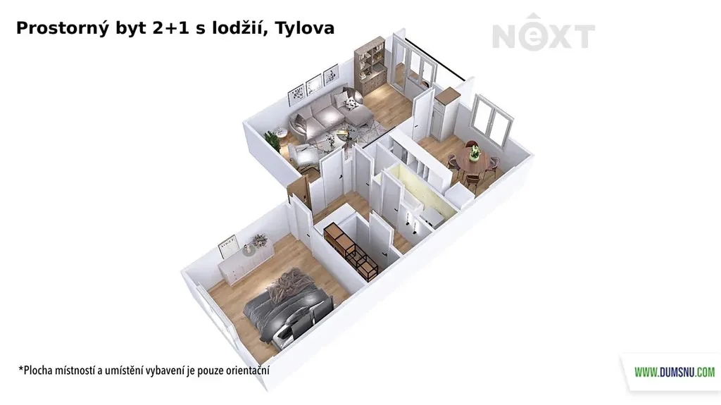 Dispozice bytu zahrnuje vstupní chodbu s praktickou komorou, ložnici, obývací pokoj se vstupem na lodžii, samostatnou kuchyni, menší koupelnu s vanou a oddělenou toaletu. Díky tomuto uspořádání nabízí byt dostatek úložného prostoru i komfortní bydlení.