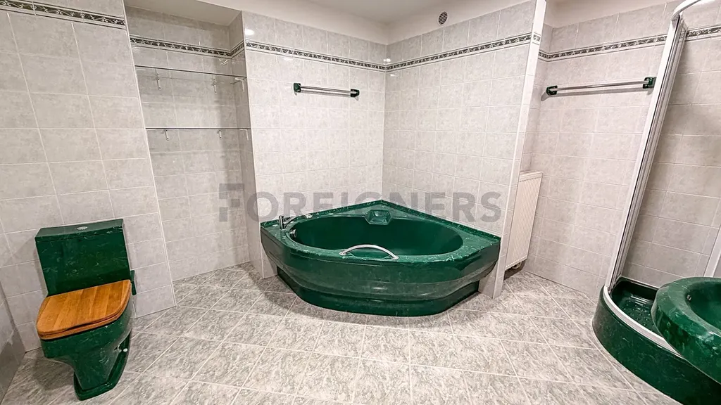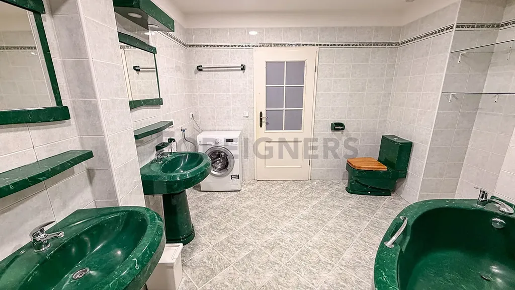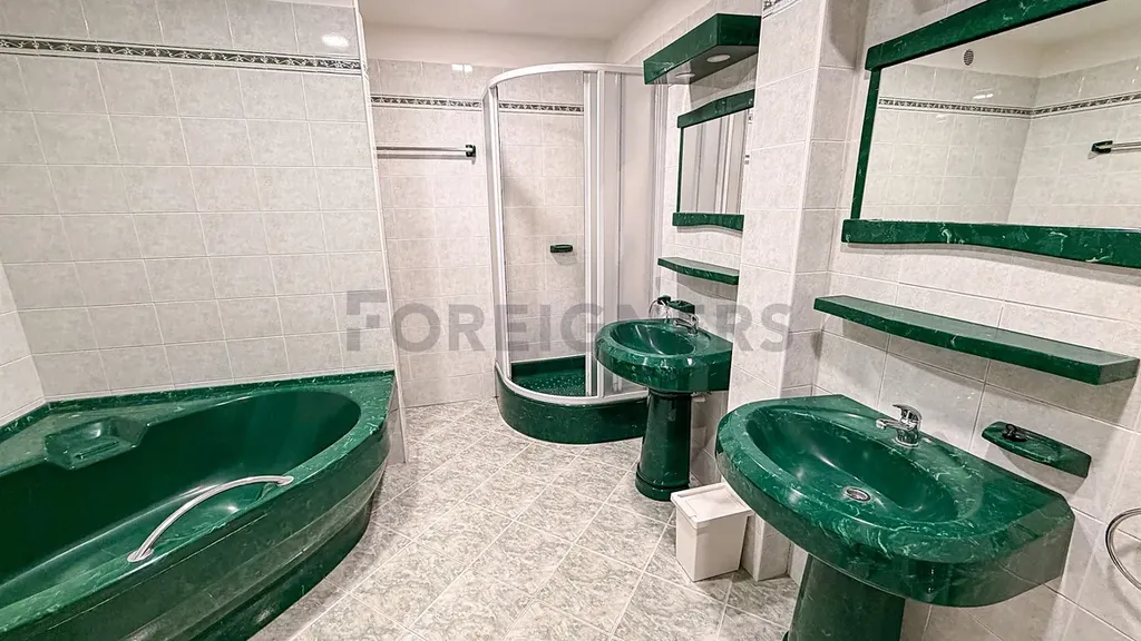 prostorná koupelna s vanou, sprchovým koutem, dvěma umyvadly, WC a pračkou