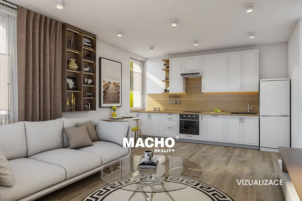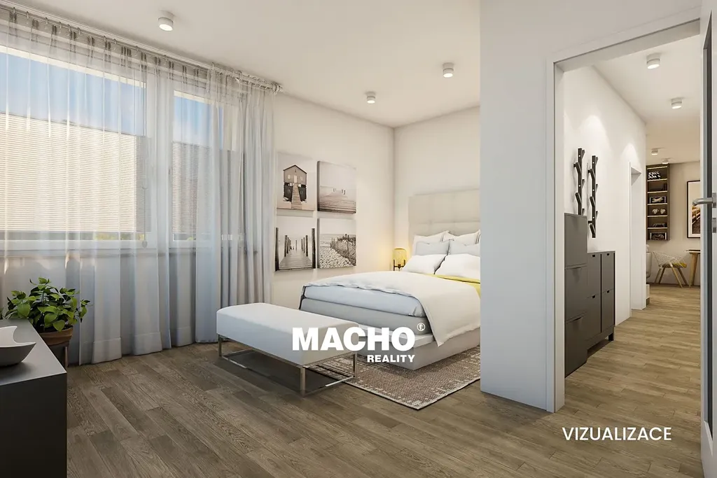 Bytová jednotka je dispozičně řešena jako 2+kk. Za vstupními dveřmi se nachází prostorná chodba, ze které je přístupný obývací pokoj s kuchyňským koutem, samostatná ložnice, koupelna se sprchovým koutem a toaletou a šatna.