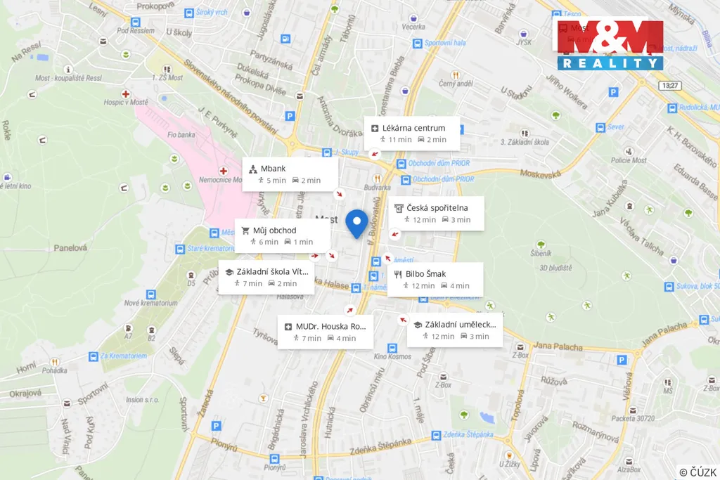 . Nabízíme Vám k pronájmu bytovou jednotku o dispozici 2+1 v osobním vlastnictví o rozloze 54 m², ve městě Most. Byt se nachází v prvním patře kompletně zrekonstruovaného cihlového domu s výtahem, v centru města. Bytová jednotka je po kompletní rekonstrukci a je částečně zařízená. Součástí bytu je zařízená kuchyně s lednicí a mrazákem, sedací souprava, vestavěné skříně na chodbě, postel, koupelna s vanou, samostatné WC. V blízkosti domu najdeme veškerou občanskou vybavenost, obchodní centrum Centrál, obchody, autobusová zastávka a další. Nájemné je 9000,- Kč + 4000,- Kč poplatek za služby ( Na dvě osoby, každá další osoba 600,- Kč ). Při podpisu smlouvy je nutné složit jeden nájem, provizi RK ve výši 13000,- Kč a vratnou kauci ve výši jednoho nájmu 13000,- Kč. V ceně nejsou zahrnuty poplatky za elektřinu. V okolí veškerá občanská vybavenost. Majitelé si vyhrazují právo pronajmout byt pouze pracujícím, s řádnou pracovní smlouvou na dobu neurčitou. Pro více informací kontaktujte makléře.