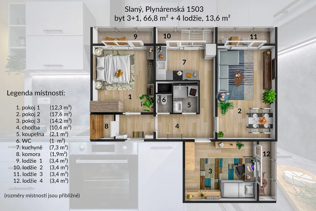 Pronájem krásného bytu 3+1/L, 66,8 m², Slaný, Plynárenská 1503