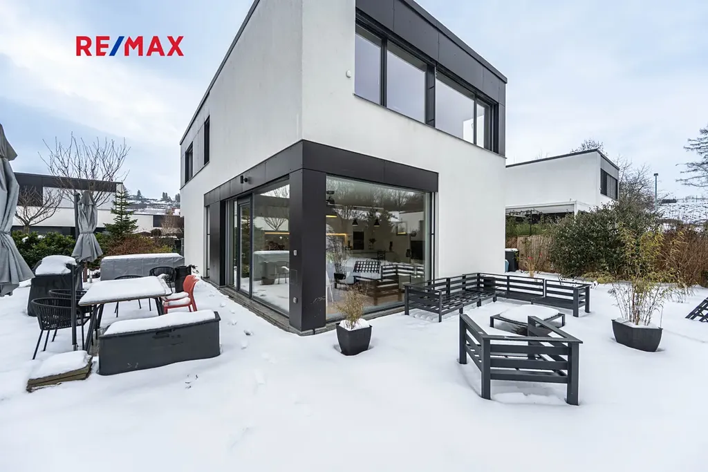 Dominantou domu je prostorný obývací pokoj (36 m2) s velkoformátovými okny a přímým vstupem na terasu a zahradu, který nabízí ničím nerušený výhled do zeleně a ideální prostor jak pro rodinný život, tak pro čas s přáteli.