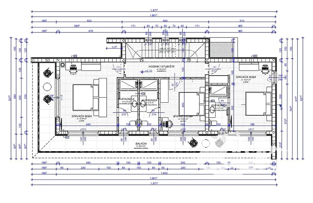 V přízemí se nachází vstupní hala s krytým průchodem, jedna ložnice s vlastní koupelnou, samostatná toaleta pro hosty a otevřený obytný prostor propojující kuchyni, jídelnu a obývací pokoj. Tento prostor plynule navazuje na částečně krytou terasu a zahradu, která vytváří ideální prostředí pro relax i společenské chvíle. V patře jsou umístěny tři prostorné ložnice, každá s vlastní koupelnou a přímým vstupem na balkon, což zajišťuje maximální komfort i soukromí pro všechny obyvatele domu.