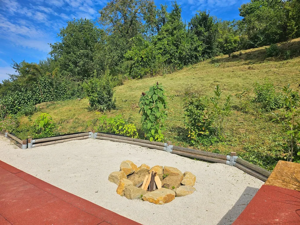 Nechybí praktický domek na nářadí či kola, ohniště s výhledem do zeleně a dětské pirátské hřiště.