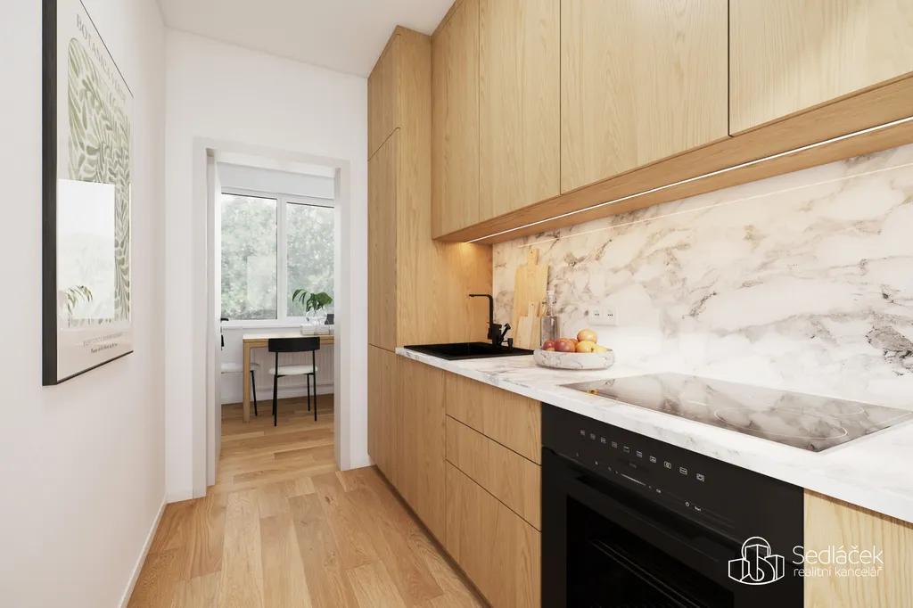 Součástí prezentace jsou také vizualizace kuchyně a obývacího pokoje, které ukazují možnou moderní podobu bytu po rekonstrukci.