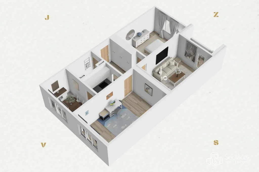 Dispozice bytu je velmi funkční – všechny pokoje jsou řešeny jako samostatné, neprůchozí. Pro lepší orientaci je k inzerátu přiložen půdorys bytu. Koupelna prošla rekonstrukcí přibližně před 8 lety (sádrokartonové jádro, sprchový kout). Ostatní části bytu jsou v původním stavu, což nabízí ideální možnost úprav dle vlastních představ. Byt je světlý, vzdušný a má velmi dobrý potenciál.