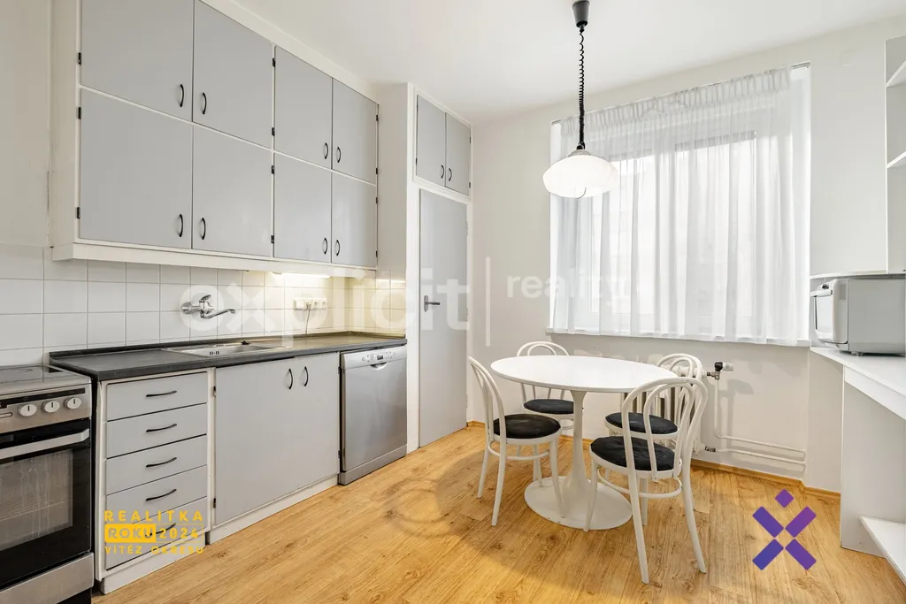 Byt má praktickou dispozici a příjemně působí svou vzdušností i množstvím úložného prostoru. Velkým plusem je samostatná kuchyň, která je vybavená troubou, lednicí, myčkou, mikrovlnnou troubou i jídelním stolem, takže je připravená na běžné fungování bez nutnosti velkých investic. Přímo v kuchyni navíc najdete spíž na potraviny, nápoje i vše, co chcete mít po ruce, ale ne na očích.