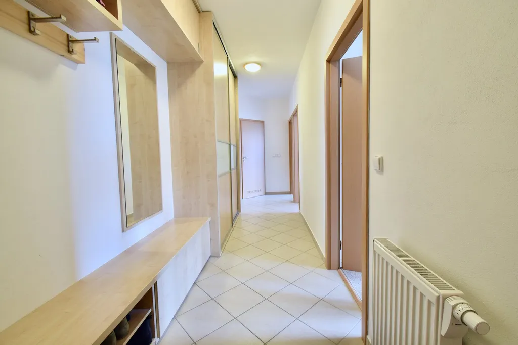 Byt se nabízí částečně vybavený. Moderní kuchyňský kout disponuje vestavěnou myčkou nádobí, lednicí, mikrovlnou troubou, elektrickou troubou, sklokeramickou deskou a digestoří. Obývací část je vybavena sedací soupravou, konferenčním stolkem, vitrínou a televizním stolkem. Jeden z neprůchozích pokojů bude nevybavený, v ložnici je k dispozici prostorná postel, vestavěné skříně a další skříňky s úložným prostorem. Poslední neprůchozí pokoj slouží jako pracovna a je vybaven psacím stolem, knihovnou a postelí. V předsíni najdeme další vestavěné skříně s úložným prostorem a také věšáková stěna. Prostorná koupelna disponuje pračkou, vanou a toaletou. Nachází se zde také dvě umyvadla a úložné prostory.