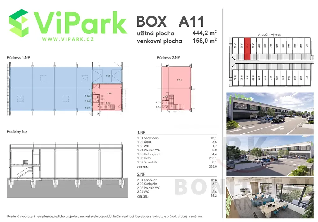 Nabízíme k prodeji zcela nové moderní komerční boxy - aktálně A10 a A11 - v podnikatelském areálu Vipark, v atraktivní lokalitě Brno Černovice na ulici Vinohradská (oblast Černovických teras). Areál se nachází na strategické poloze v blízkosti dálnice, s výbornou dostupností.