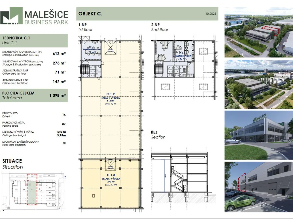 - 273 m² výrobních / skladových prostor (C1.3), světlá výška 3,75 m