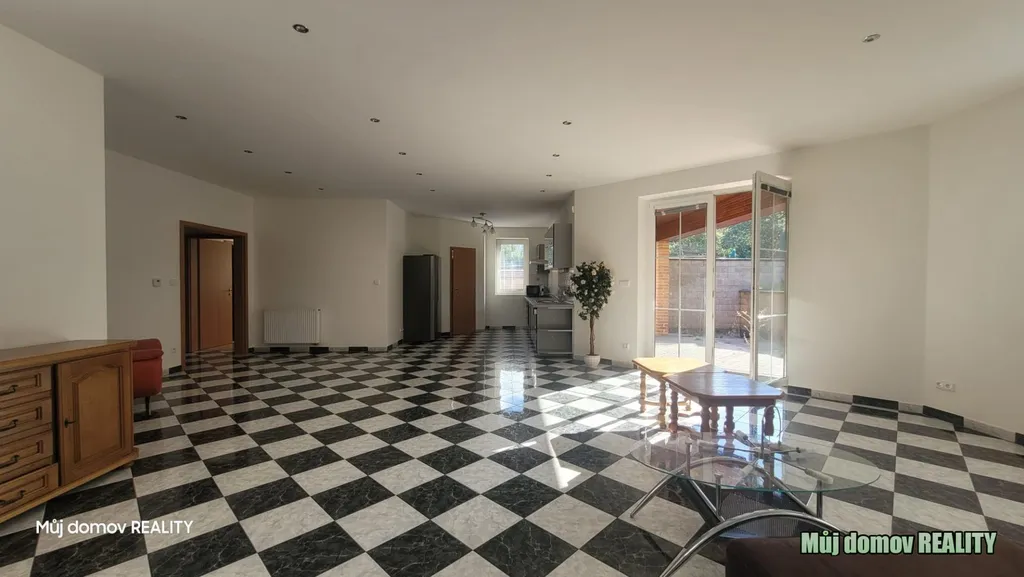 Dům nabízí tři neprůchozí ložnice, prostorný obývací pokoj s kuchyňským koutem a přímým vstupem na terasu.