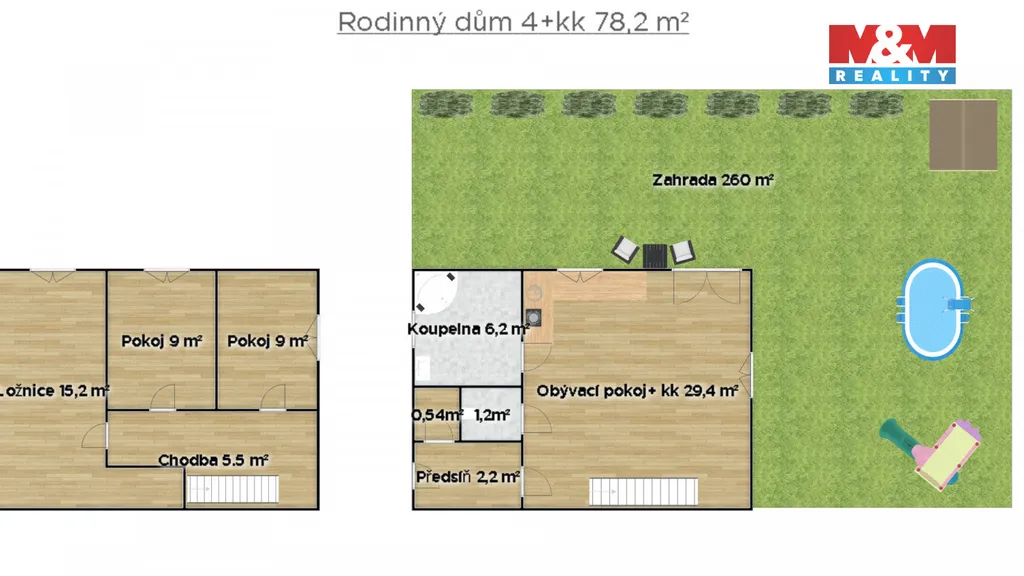 Nabízíme vám k pronájmu rodinný dům o dispozici 4+kk se zahradou v Poděbradech. Celková plocha domu činí 78,2 m² a náleží k němu zahrada 260 m² s terasou a zahradním domkem. V přízemí naleznete prostorný obývací pokoj s kuchyňským koutem a vstupem do zahrady, koupelnu s vanou, toaletu a předsíň. V patře pak tři neprůchozí pokoje, které se dají využívat jako ložnice. Dům byl postaven v roce 2019, přízemí je vytápěno podlahovým topením a v patře radiátory. Lázeňské město Poděbrady má kompletní občanskou vybavenost. Měsíční nájemné činí 25.000 Kč, záloha na vodné a stočné 500 Kč/os, elektřina bude přepsána na nájemce (spotřeba cca 8-9 MWh ročně). Kauce činí 25.000 Kč a provize RK 25.000 Kč.