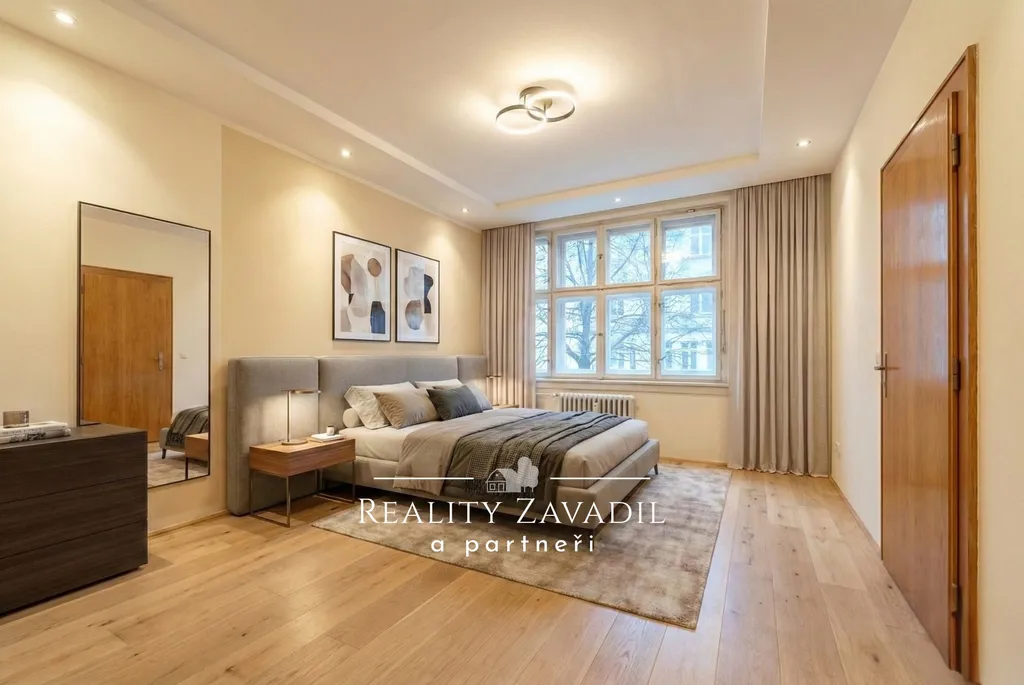 Byt disponuje velkorysou dispozicí s prostornými pokoji, jídelnou, koupelnou, samostatnou toaletou a menším pokojem, který dříve sloužil jako pokoj pro služebnictvo. Výhodou jsou vysoké stropy a původní dřevěné parkety, které po přebroušení získají opět vzhled nových podlah.